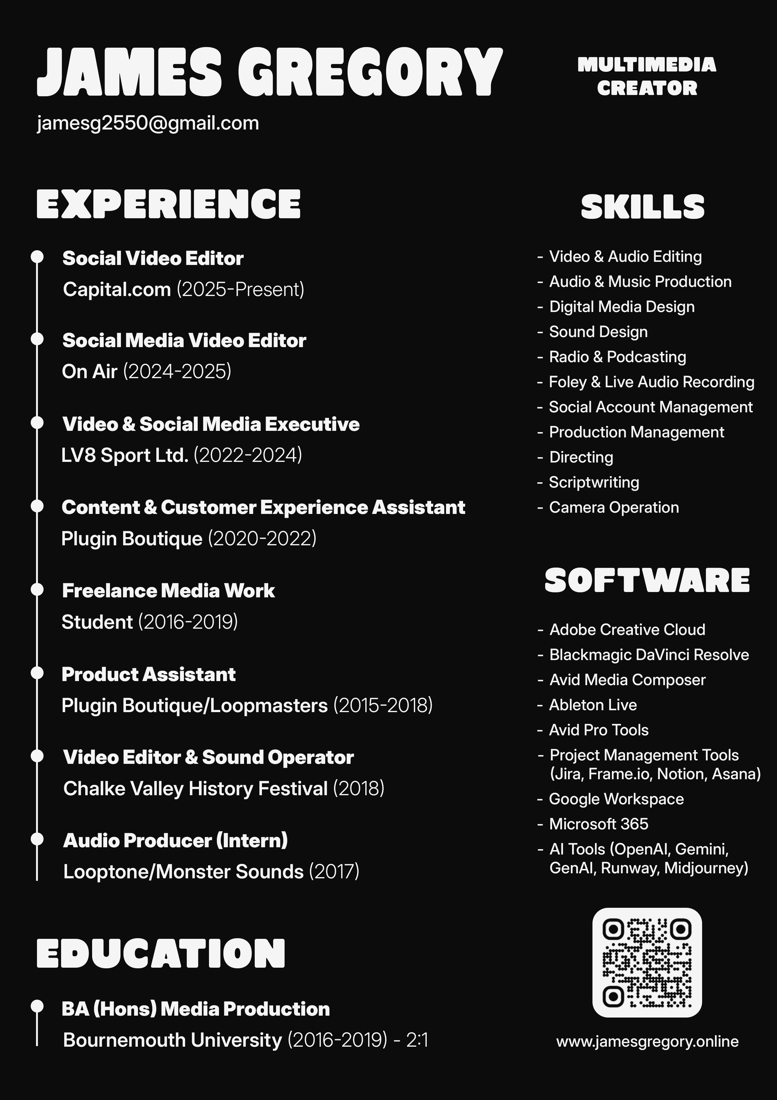 MULTIMEDIACREATOR WARNING: FLASHING IMAGERY WITH SKILLS IN:VIDEO • AUDIO • MUSIC • DESIGN I’m James, a multimedia creator with extensive experience in the media and music industries. I specialise in video and audio editing, music production and digital design, driven by a passion for crafting engaging content.